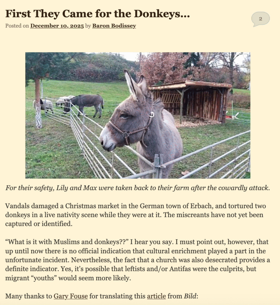 https://gatesofvienna.net/2025/12/first-they-came-for-the-donkeys/