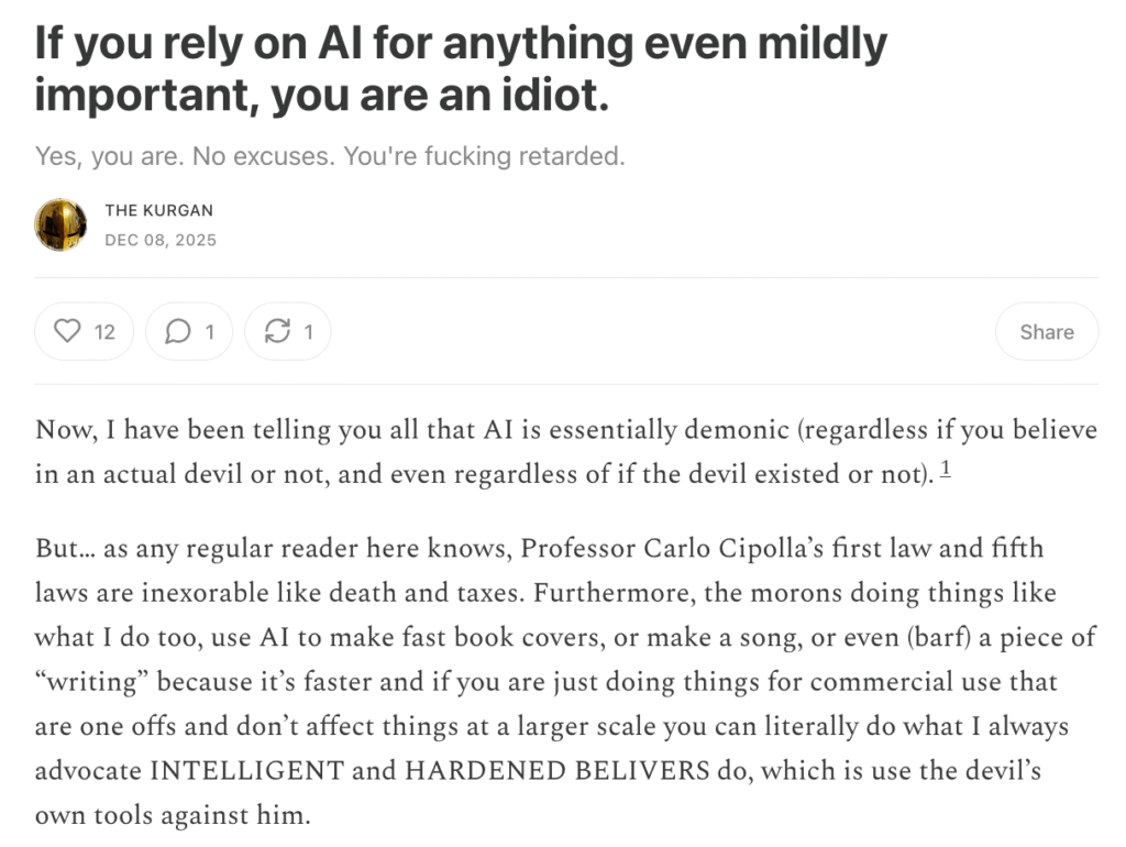 https://kurganfiction.substack.com/p/if-you-rely-on-ai-for-anything-even