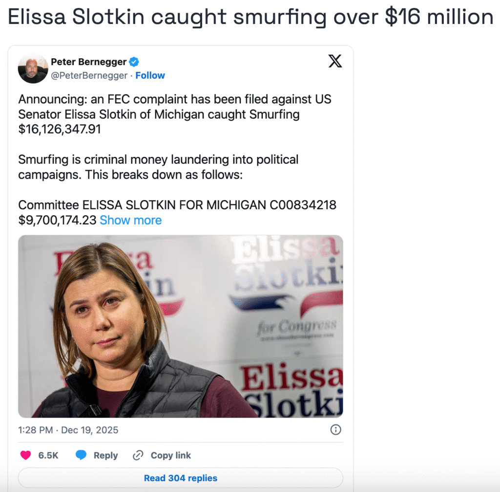https://www.americanpartisan.org/2025/12/elissa-slotkin-caught-smurfing-over-16-million/