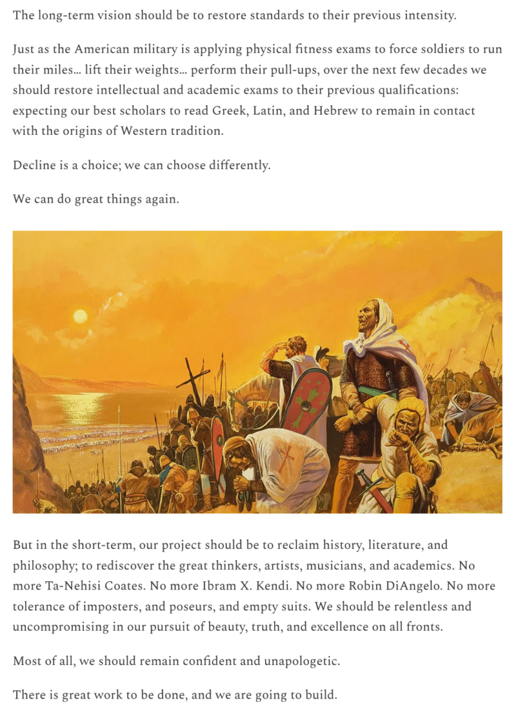 Editor’s Note: This piece is worth (and requires) several read-throughs, interspersed with thought. It is the first article (maybe Yarvin; maybe) in my online life that helped moved me to think about civilizational reconstruction, rather than simply smashing those who need to be smashed. Start with the end material below…
