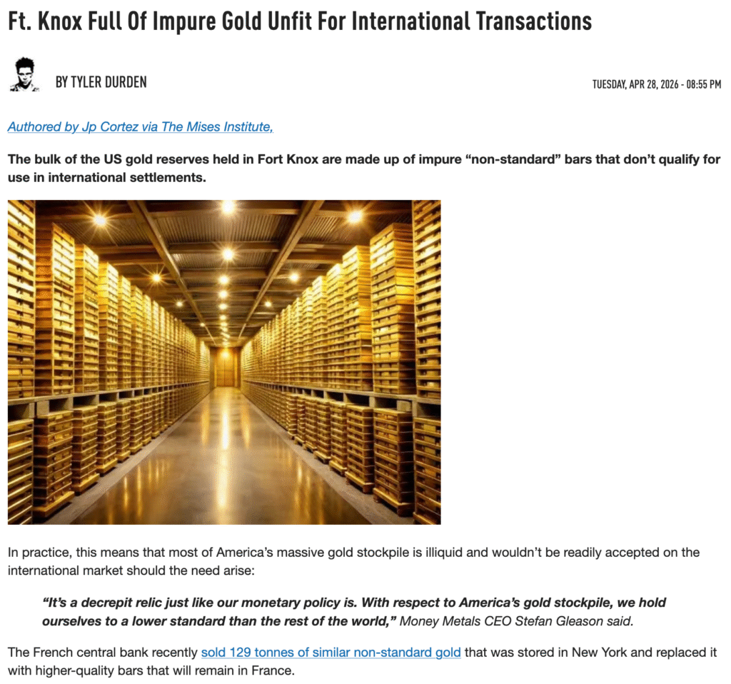 https://www.zerohedge.com/precious-metals/ft-knox-full-impure-gold-unfit-international-transactions